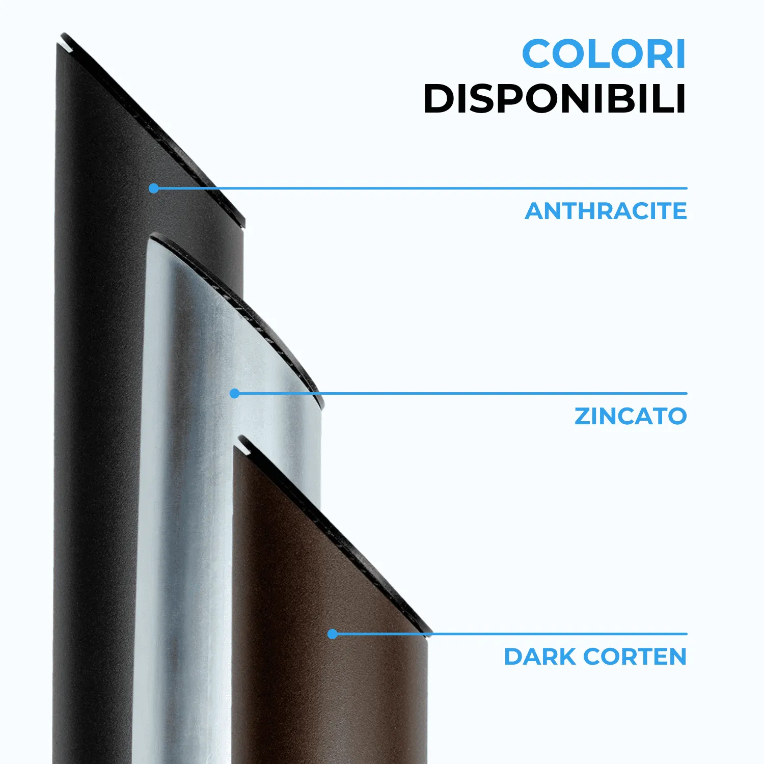 | Verniciatura | Acciaio zincato: non verniciato Dark Corten e Anthracite: verniciatura a polvere |