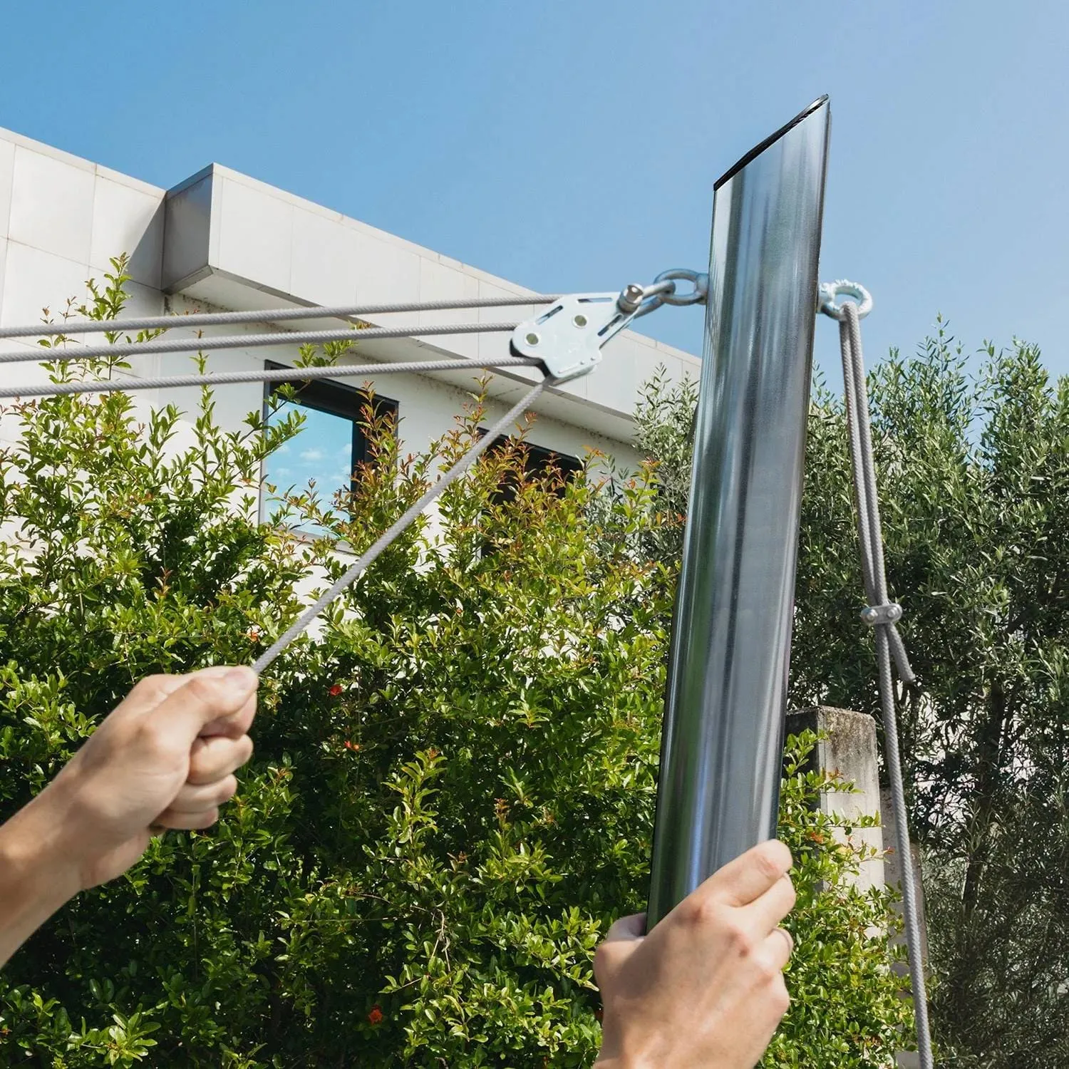 Sistema a paranco per il tensionamento della vela, in modo da moltiplicare la forza grazie alle pulegge. Per esempio, applicando solo 20 kg alla cima, riusciremo a tensionare il vertice di 60 kg!