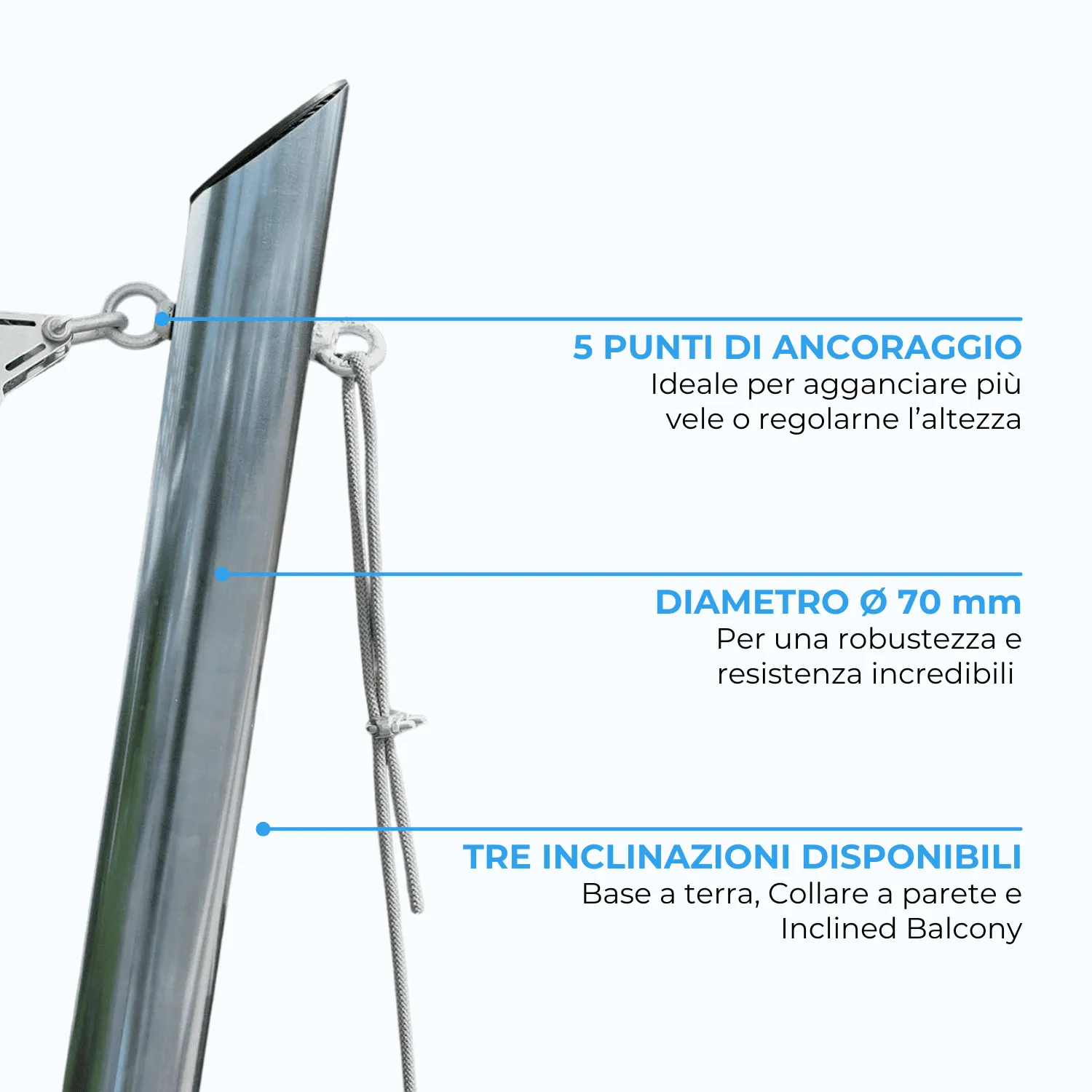 Il palo per vele ombreggianti EZ Mast ha una struttura in acciaio alta 260 cm (253 cm in perpendicolare per versioni inclinate) con diametro 70 mm, progettato per offrire robustezza e resistenza incomparabili, rispetto ai suoi competitor.