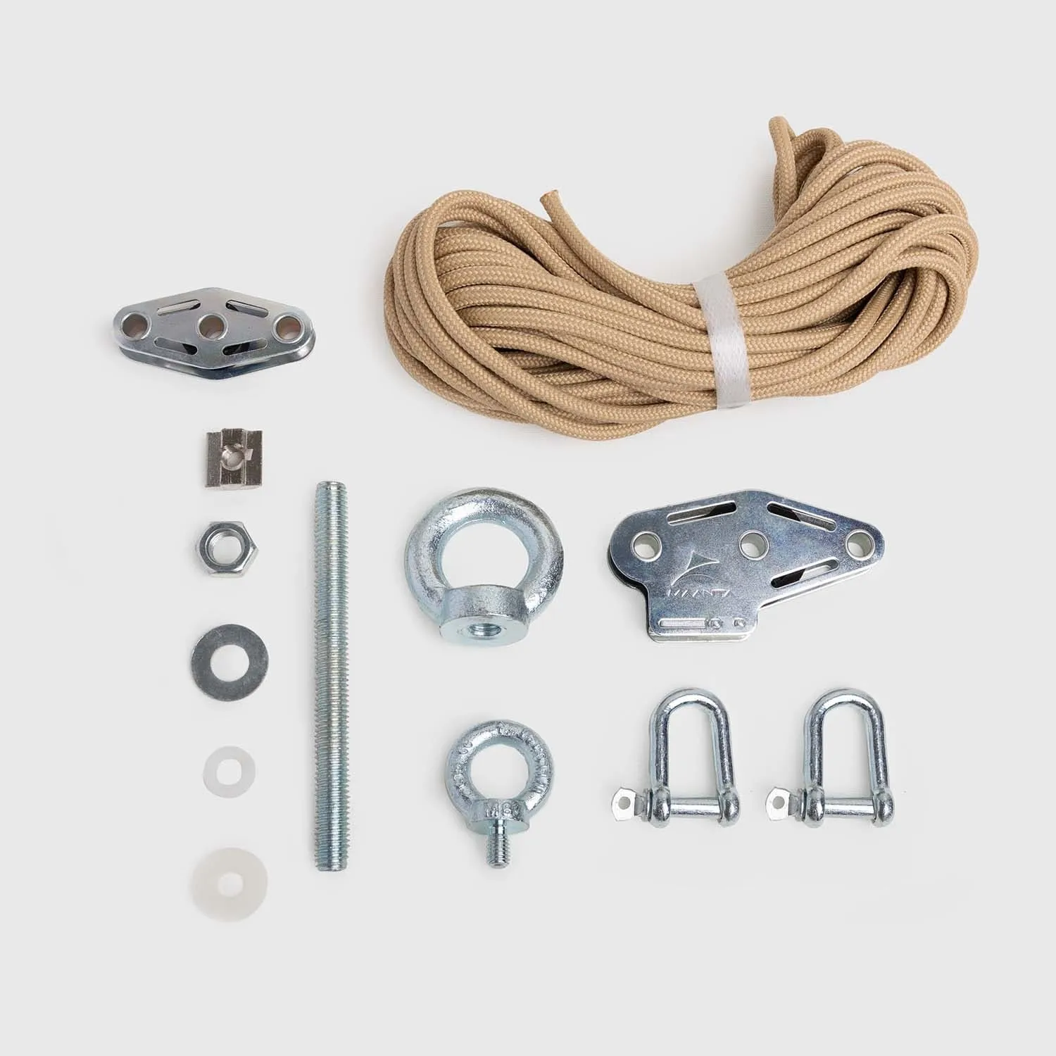 | Contenuto confezione | Dato a T (utile per Alu Simple) Golfare maschio M8 Zincato Rondella in nylon 2 Grilli a D in Acciaio Zincato Cima nautica Puleggia Muscle x3 Puleggia con strozzascotte Muscle x3 Barra filettata M12x13 cm per ancoraggio su cemento Golfare femmina M12 zincata da avvitare sulla barra filettata |