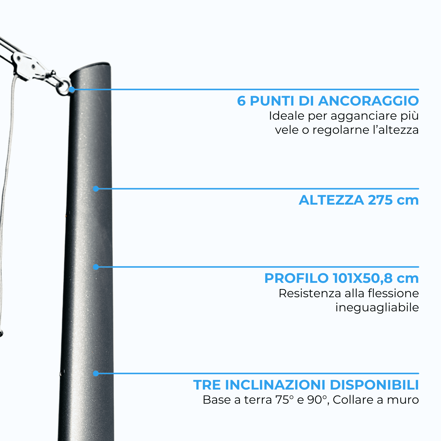 Il palo in acciaio Ulisse, grazie ai suoi 6 punti di ancoraggio è progettato per installazioni multivela. L’altezza di 275 cm e il profilo ellittico da 101×50,8 cm gli consente un’ottima robustezza e resistenza contro il vento.