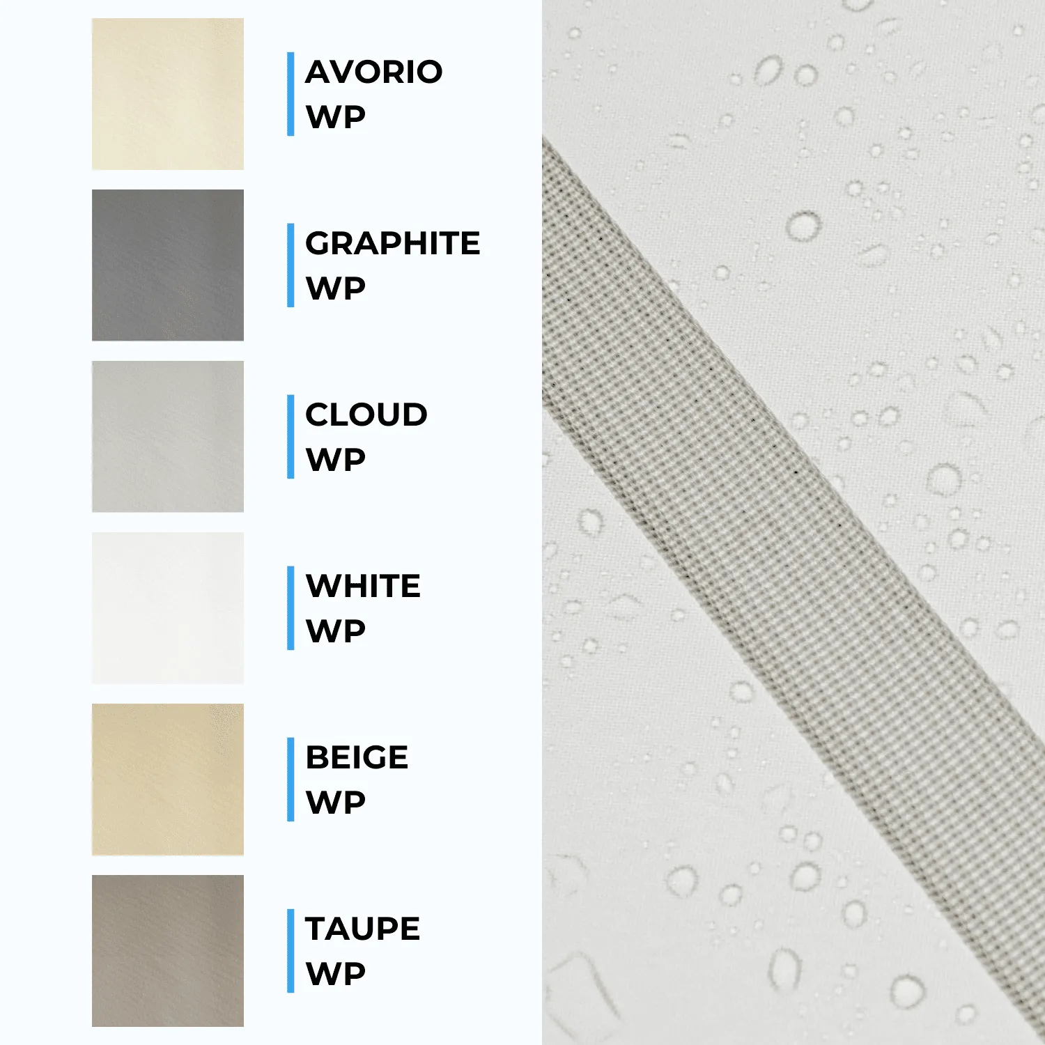 • Tessuto impermeabile 220 gsm: poliestere maggiorato con protezione ultravioletta UPF 50+ e colonna d’acqua 100 mm per pioggia intensa.