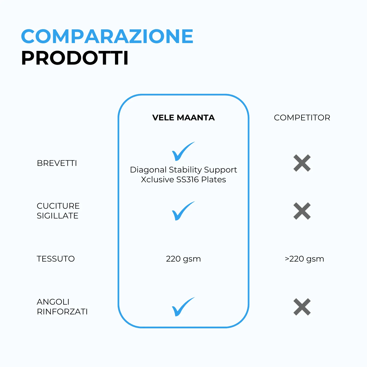 • DSS Diagonal Stability Support (brevetto esclusivo Maanta): fettuccia diagonale brevettata che garantisce stabilità superiore e previene la formazione di accumuli d’acqua al centro della vela.