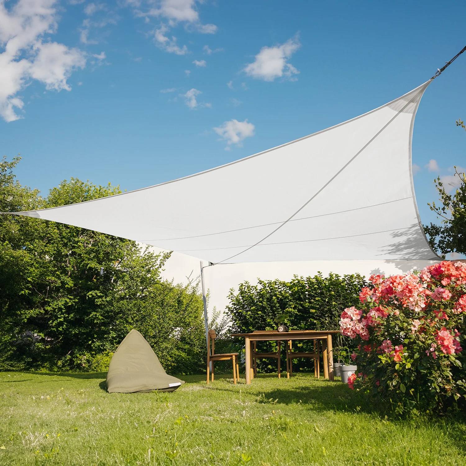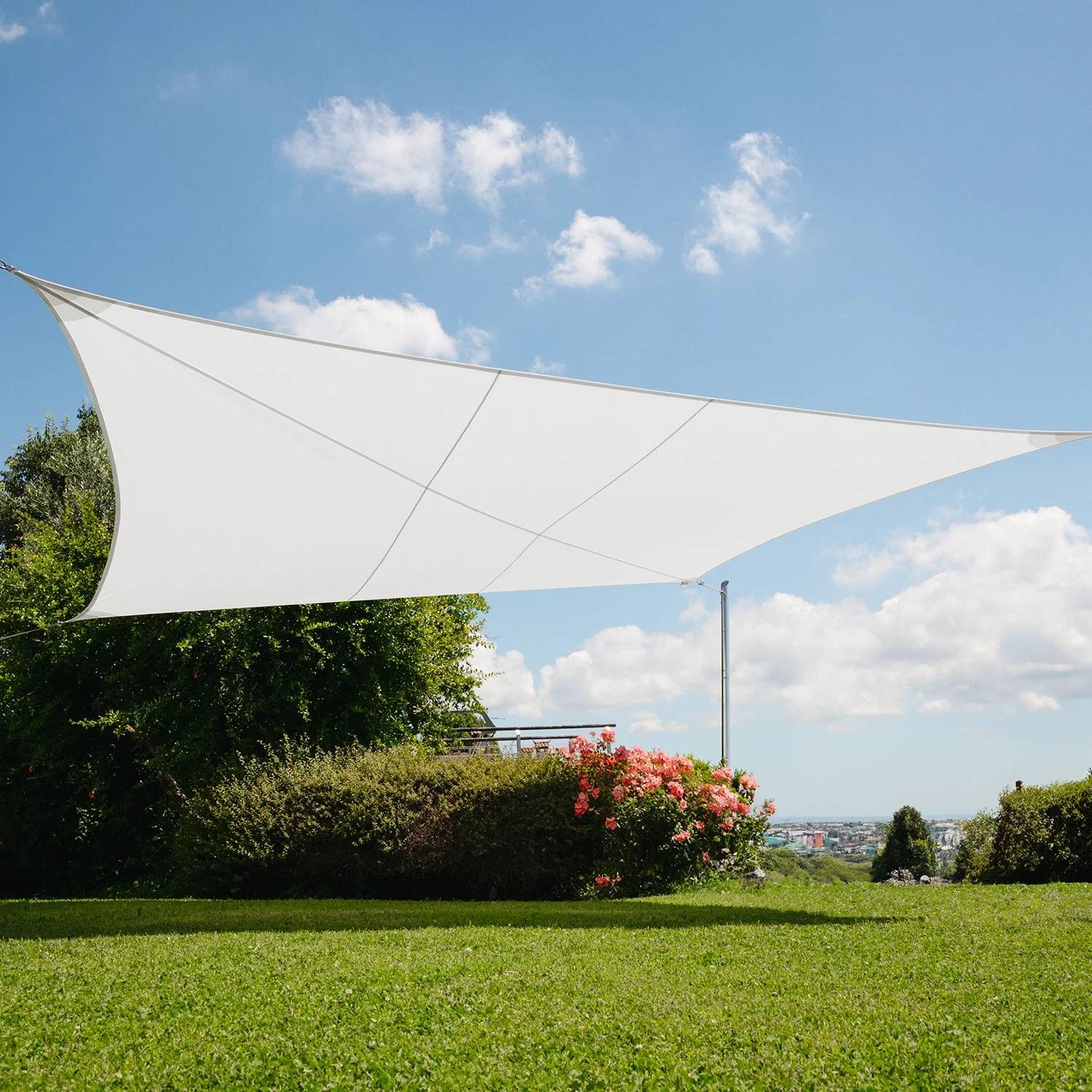 Vela ombreggiante impermeabile ideale per giardini, terrazzi e piscine con sistema brevettato anti-accumulo acqua. Progettata dal marchio Maanta, combina protezione completa da pioggia e sole con un prezzo accessibile.