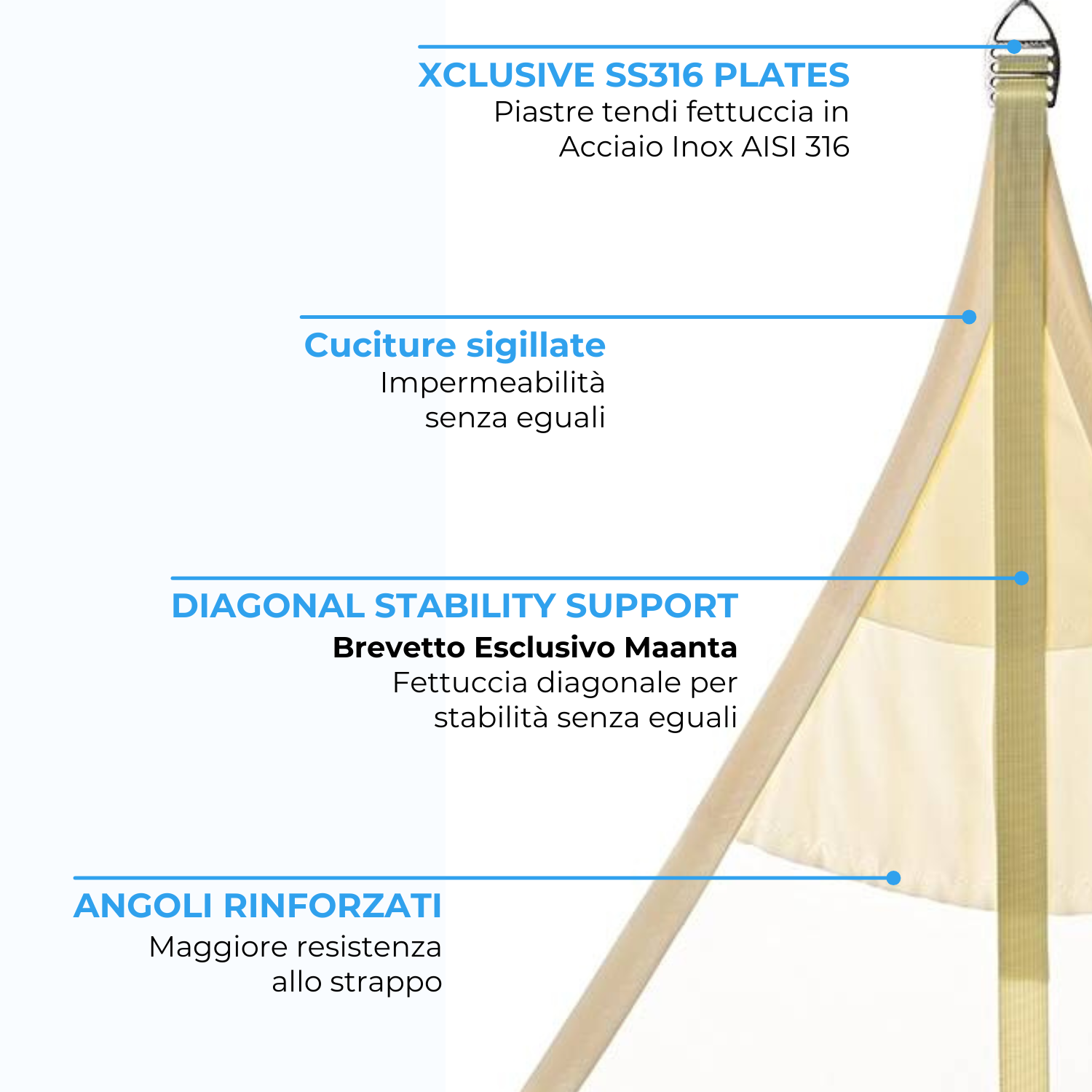 • Maanta Xclusive SS316 plates: piastre angolari in acciaio inox 316 resistente a corrosione e salsedine per tensionamento ottimale della fettuccia diagonale.