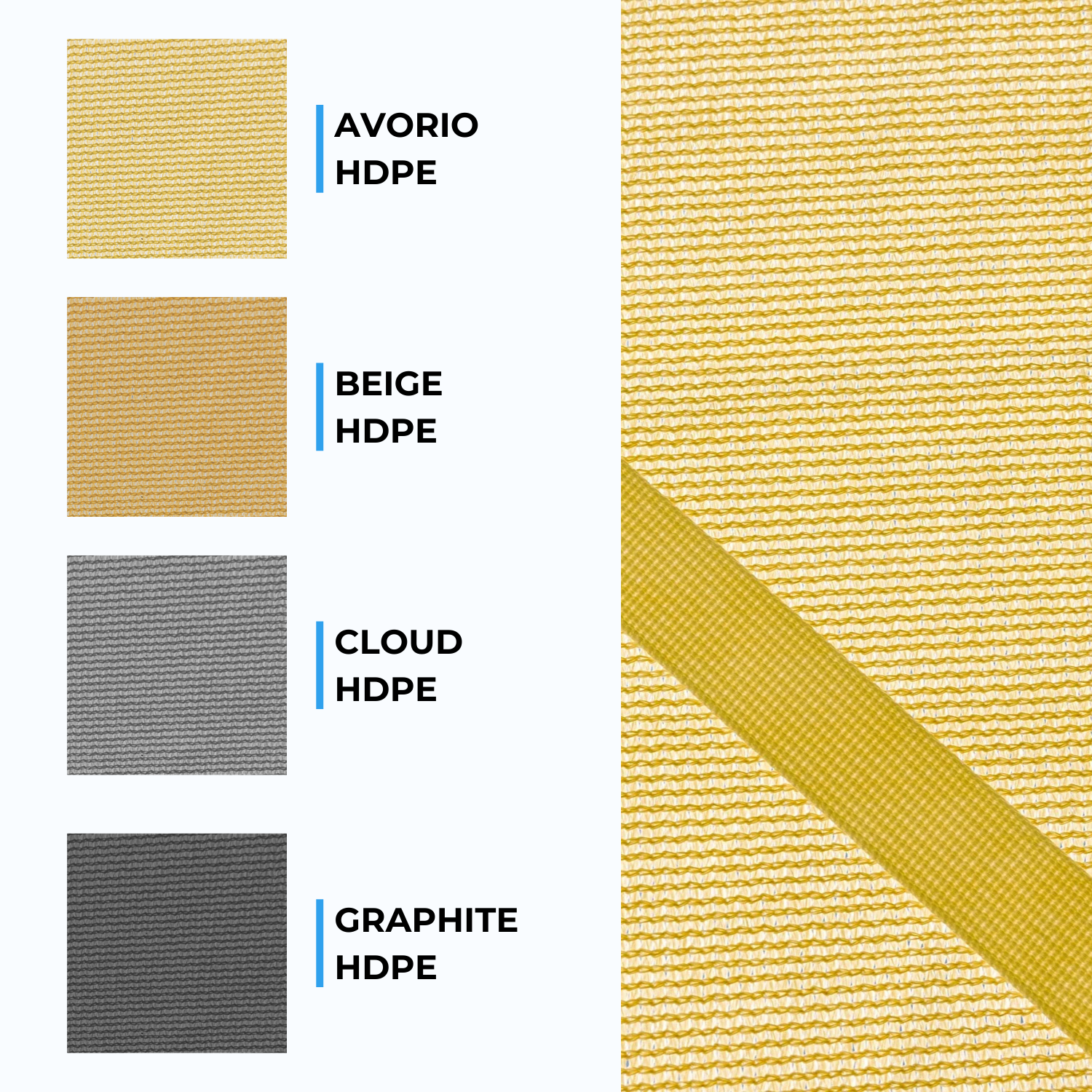 La vela è disponibile in 4 colori (Ivory HDPE, Cloud HDPE, Beige HDPE, Graphite HDPE) e oltre 17 varianti di dimensione.