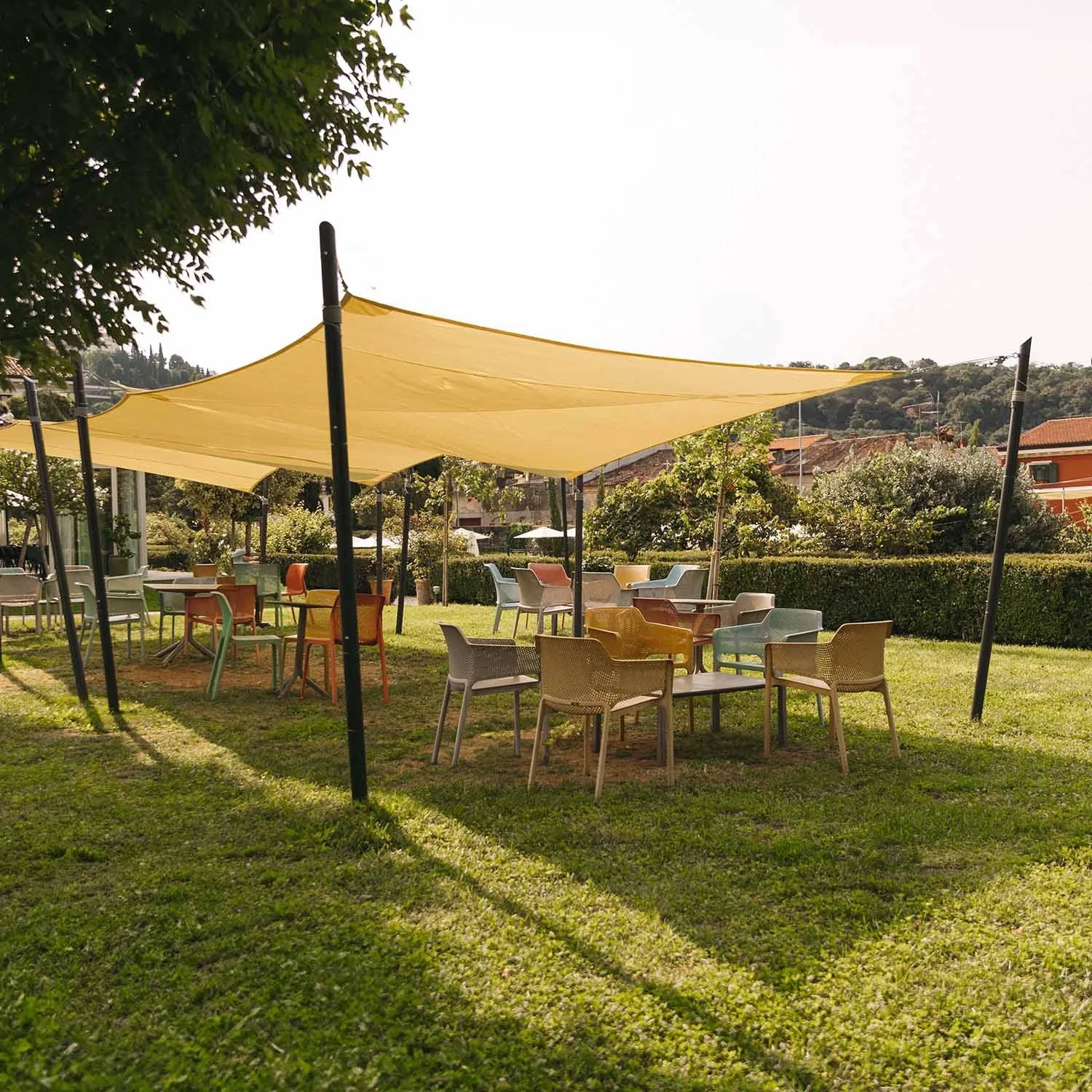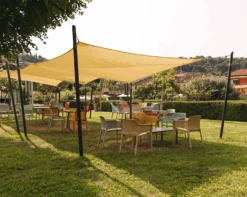 Perfetta per installazioni in giardini, terrazzi e spazi esterni, questa vela traspirante offre una protezione solare affidabile mantenendo la circolazione d’aria naturale.